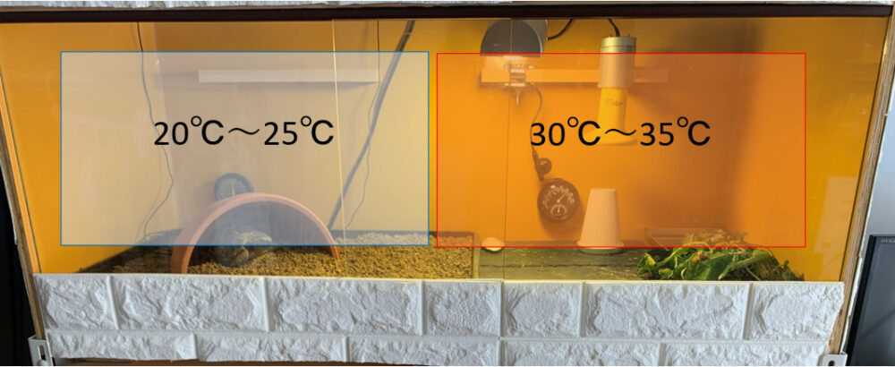 なお「保温器具と別にホットスポットも必要」という意見もあるかと思いますが、私は温度勾配さえできていればリクガメには必須でないかなと考えています。