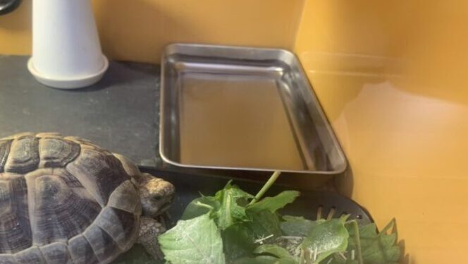 ただこのエサ皿にしてから、いろんな野草をサラダにして乗せやすくなりましたし、リクガメも食べやすくなったようです。