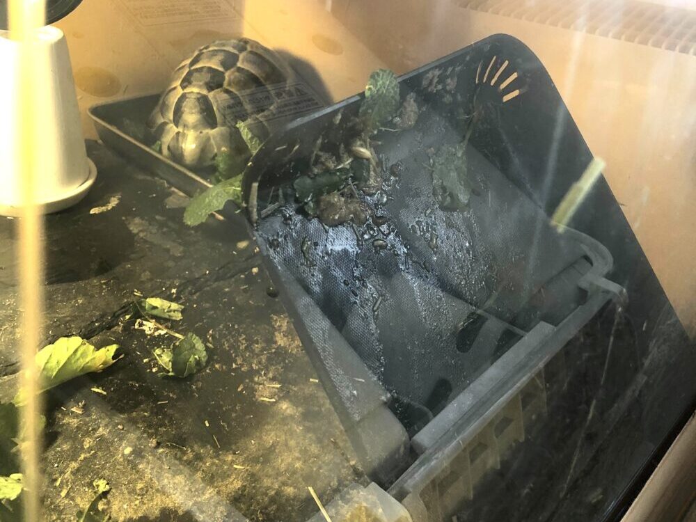 大前提として、リクガメはエサをお行儀よく食べるという概念はないので、かなりとっ散らかります。