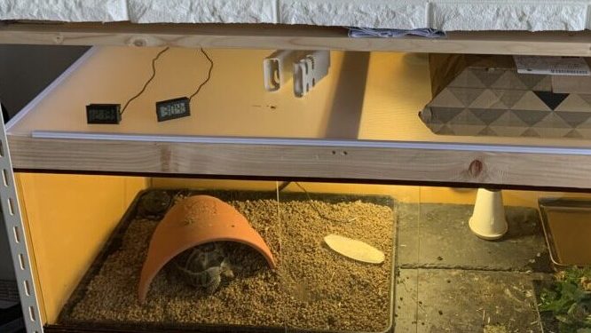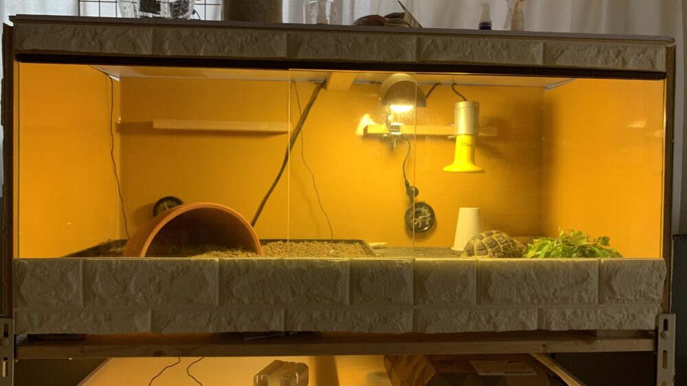 リクガメは高くジャンプすることはないので上から脱走することはないですが、本来は気密性を高め保温や保湿を安定させるためにもフタはあったほうが良いです。