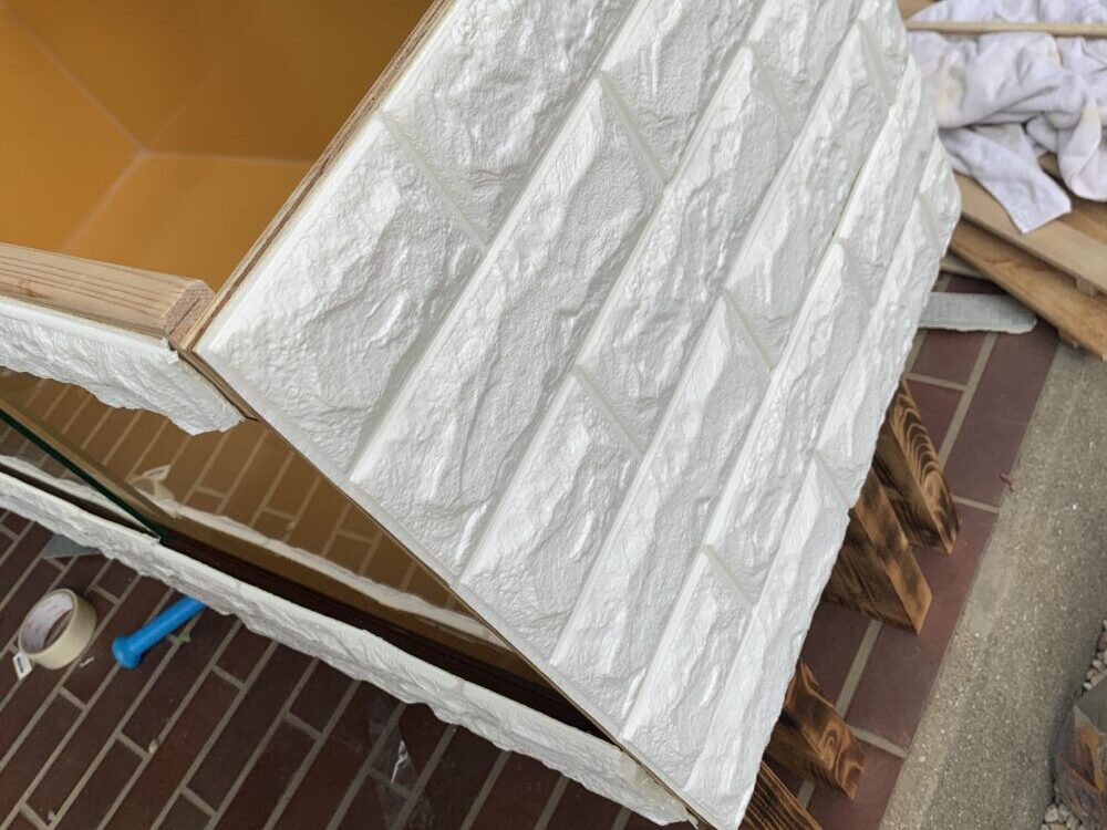 我が家でも塗装してもよかったのですが「レンガ調の外見にしたらおしゃれかも」ということでダイソーのクッションレンガを貼り付けました。