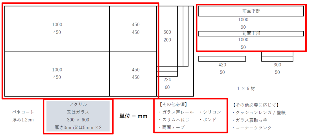 木材同士であればミリ単位はある程度ごまかしが利きますが、ガラスなどはサイズを変えるのが困難なので設計する際にご注意を。
